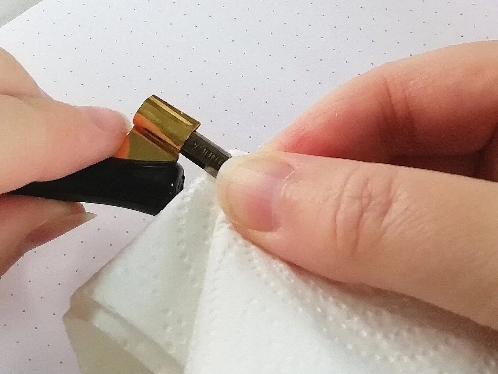 Use some kitchen paper or cloth to protect your fingers when inserting and removing nibs from calligraphy pens - they’re super sharp!
